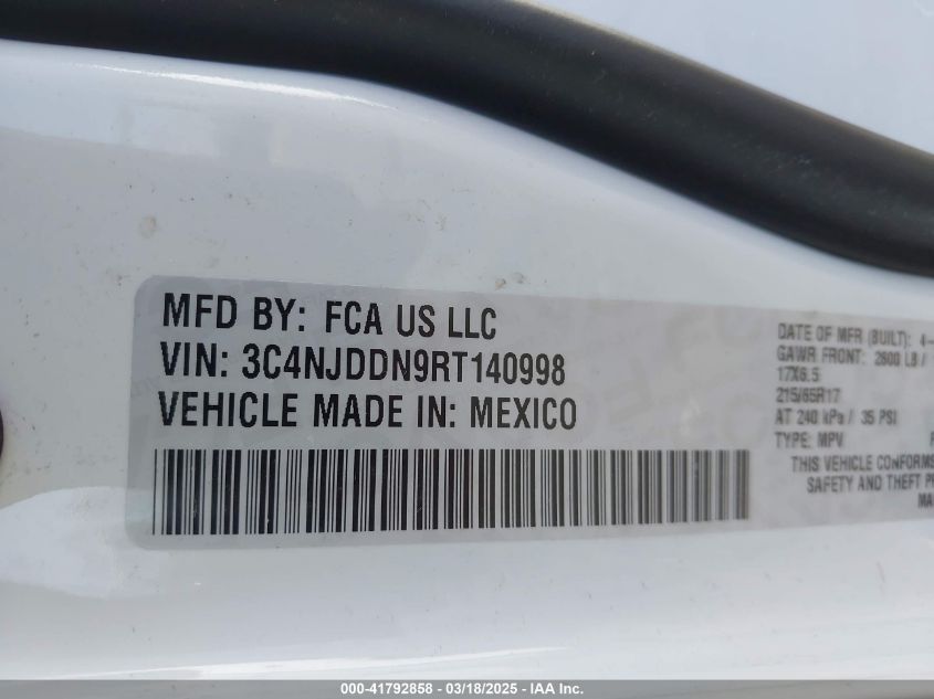 Color WhiteCylinders 4Drive Full driveVIN 3C4NJDDN9RT******State Run & Drive VerifiedDamage Rear left AutoRIA
