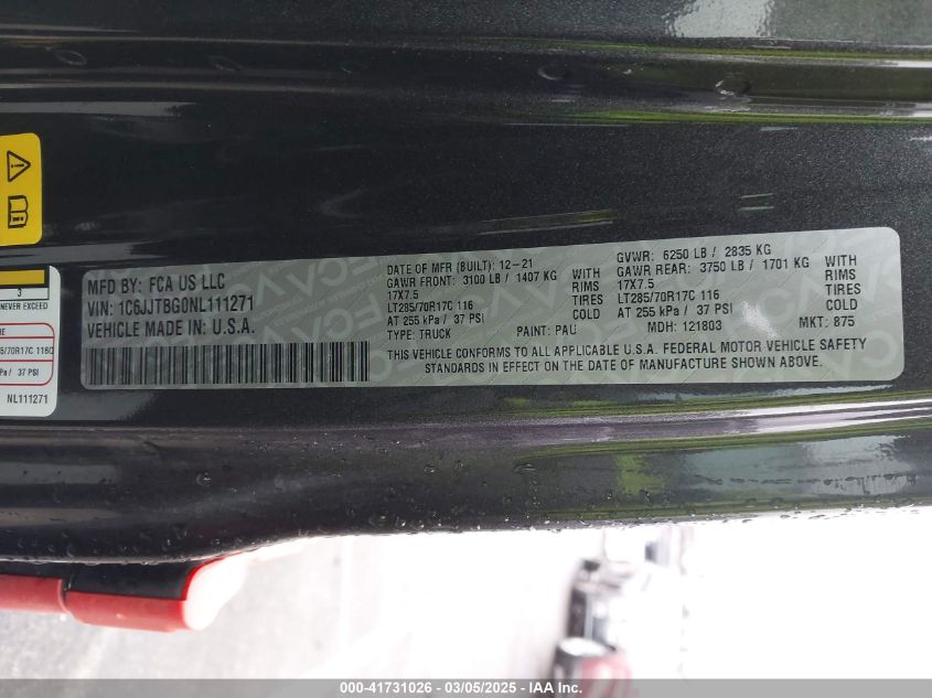Color BlackCylinders 6Drive Full driveVIN 1C6JJTBG0NL******State Run & Drive VerifiedDamage Front or backAuction date 2025-03-20 AutoRIA