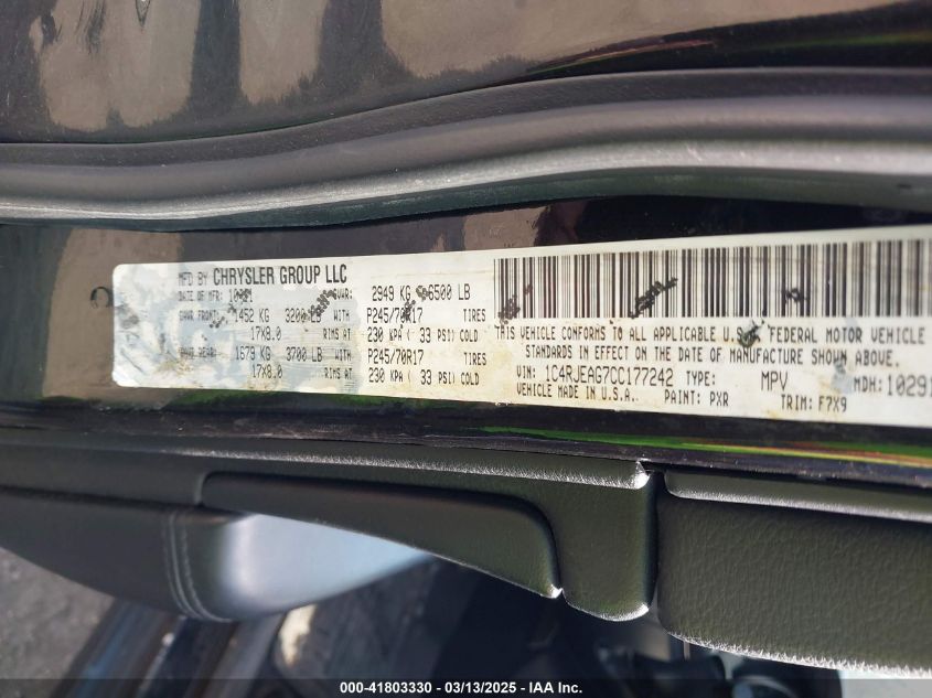 Color BlackCylinders 6Drive UnknownVIN 1C4RJEAG7CC******State Run & Drive VerifiedDamage Front leftAuction date 2025-03-20 AutoRIA
