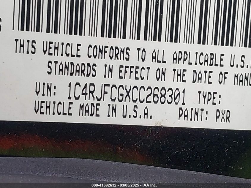Color BlackCylinders 6Drive Full driveVIN 1C4RJFCGXCC******State Run & Drive VerifiedDamage Vandalism AutoRIA