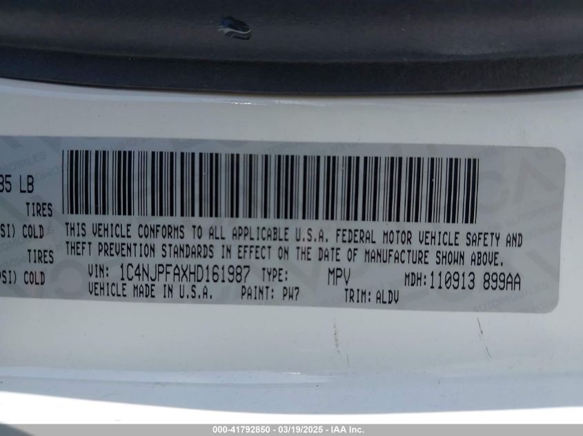Color WhiteCylinders 4Drive Front wheel driveVIN 1C4NJPFAXHD******State Run & Drive VerifiedDamage Front or back