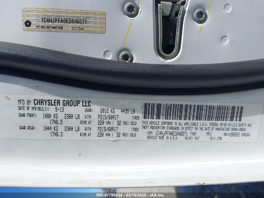 Color WhiteCylinders 4Drive Front wheel driveVIN 1C4NJPFA0ED******State Run & Drive VerifiedDamage Back AutoRIA