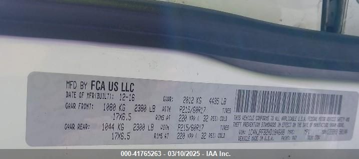 Color WhiteCylinders 4Drive Front wheel driveVIN 1C4NJPFB2HD******State Run & Drive VerifiedDamage Front or back