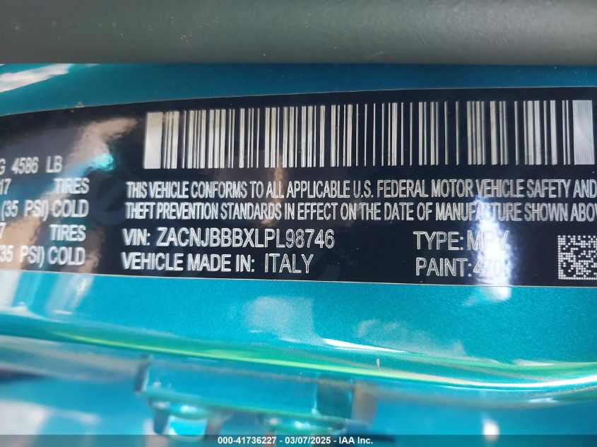 Color TurquoiseCylinders 4Drive Full driveVIN ZACNJBBBXLP******State Run & Drive VerifiedDamage Front right AutoRIA