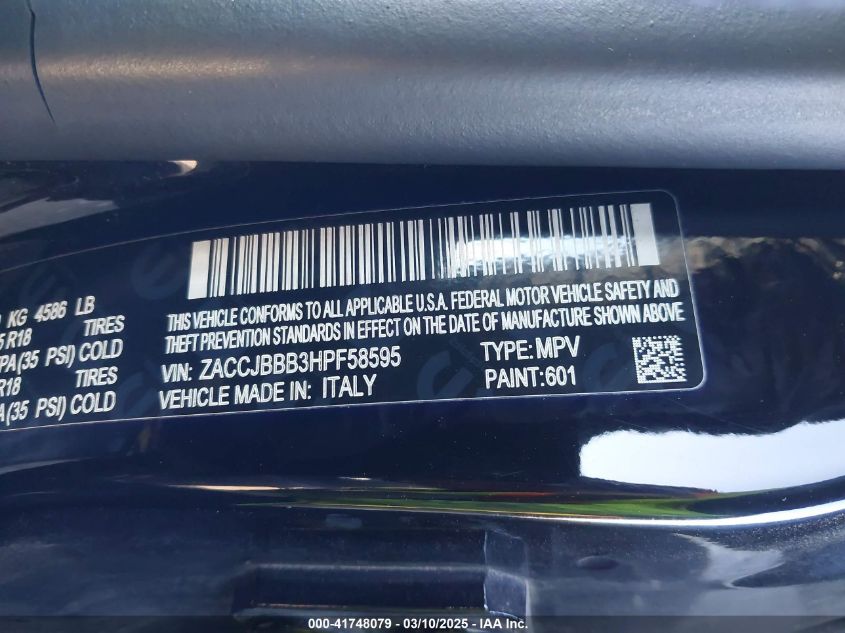 Color BlackCylinders 4Drive Full driveVIN ZACCJBBB3HP******State Run & Drive VerifiedDamage Right side AutoRIA