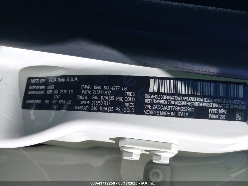 Color WhiteCylinders 4Drive Front wheel driveVIN ZACCJABT7GP******State Run & Drive VerifiedDamage Front or back AutoRIA
