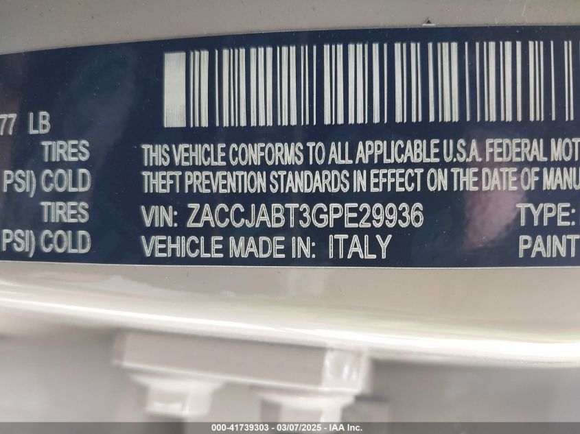 Color SunburnCylinders 4Drive Front wheel driveVIN ZACCJABT3GP******State Run & Drive VerifiedDamage Left side AutoRIA