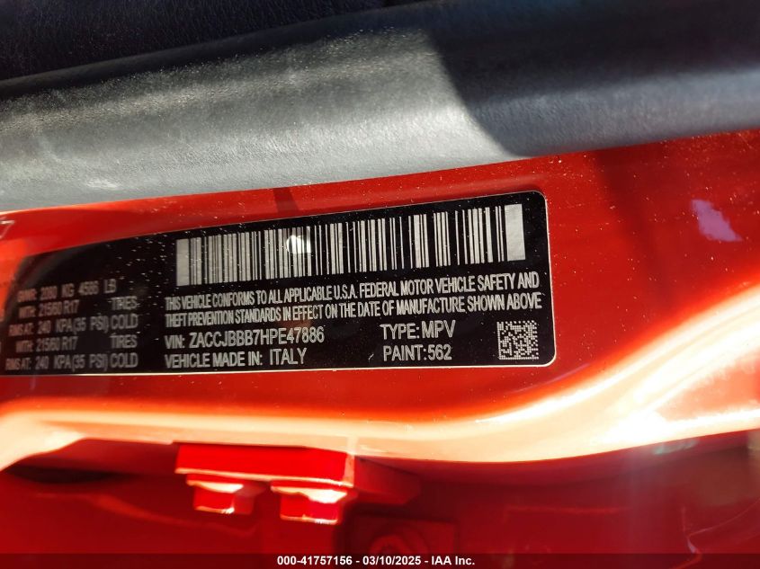 Color OrangeCylinders 4Drive Full driveVIN ZACCJBBB7HP******State Run & Drive VerifiedDamage Right sideAuction date 2025-03-20 AutoRIA