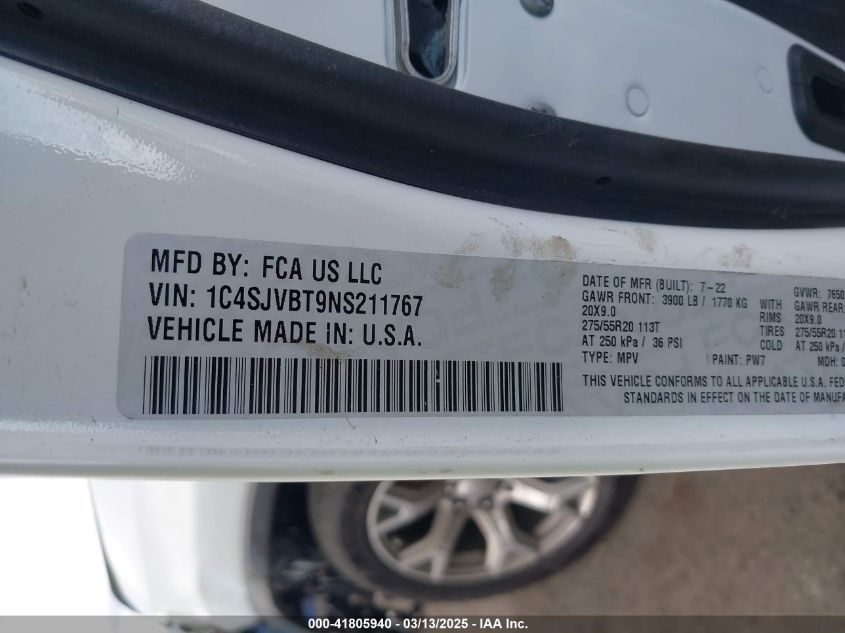 Color WhiteCylinders 8Drive Full driveVIN 1C4SJVBT9NS******State Run & Drive VerifiedDamage Front leftAuction date 2025-03-26 AutoRIA