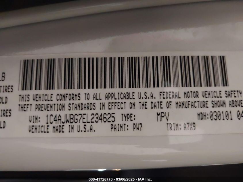 Color WhiteCylinders 6Drive Full driveVIN 1C4AJWBG7EL******State Run & Drive VerifiedDamage Front left AutoRIA