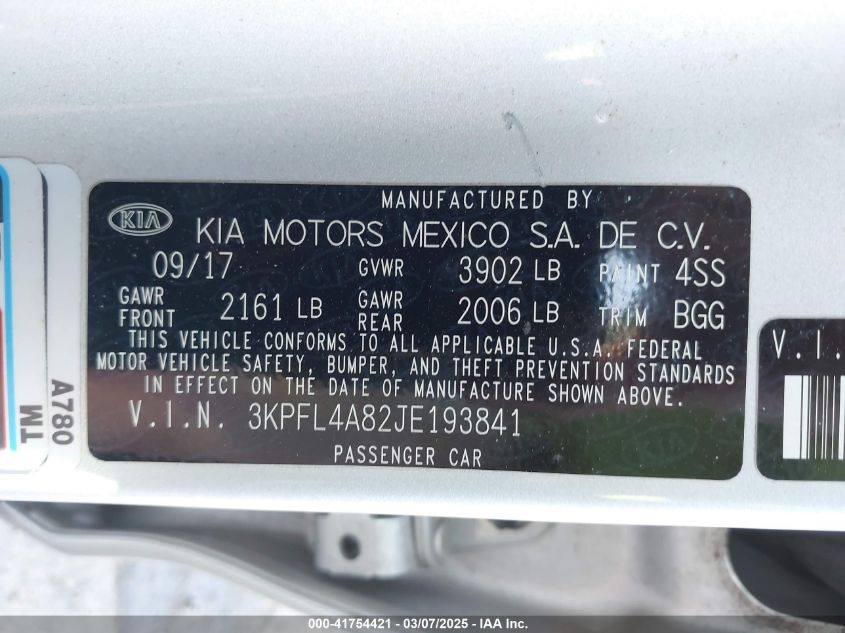 Color SilverCylinders 4Drive Front wheel driveVIN 3KPFL4A82JE******State Run & Drive VerifiedDamage Front or back AutoRIA