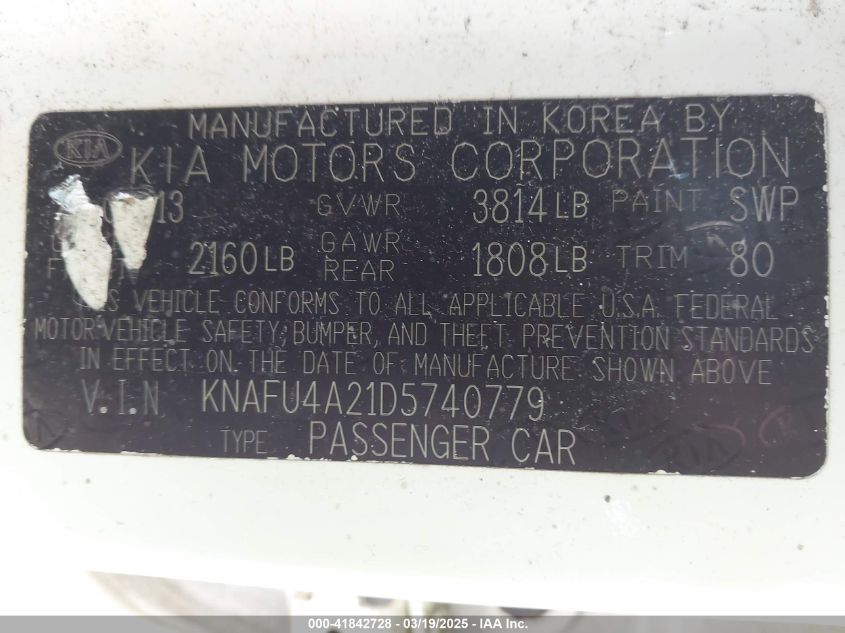 Color WhiteCylinders 4Drive Front wheel driveVIN KNAFU4A21D5******State Run & Drive VerifiedDamage BackAuction date 2025-03-26 AutoRIA