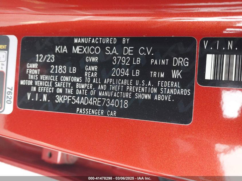2024 KIA FORTE 2024 Gasoline, 2.0, Front wheel drive, VIN - 3KPF54AD4RE****** from the USA