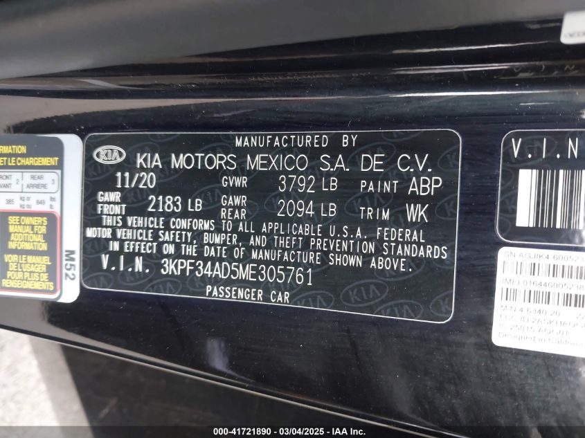 2021 KIA FORTE 2021 Gasoline, 2.0, Front wheel drive, VIN - 3KPF34AD5ME****** from the USA