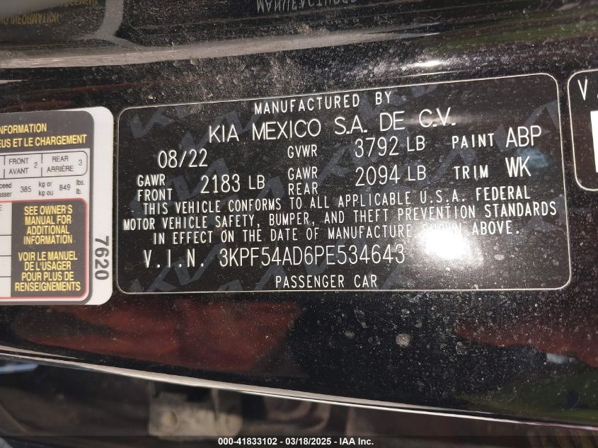Color BlackCylinders 4Drive Front wheel driveVIN 3KPF54AD6PE******State Run & Drive VerifiedDamage Front or back AutoRIA