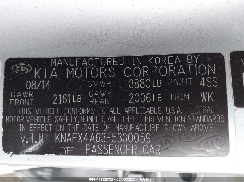 2015 KIA FORTE 2015 Gasoline, 1.8, Front wheel drive, VIN - KNAFX4A63F5****** from the USA