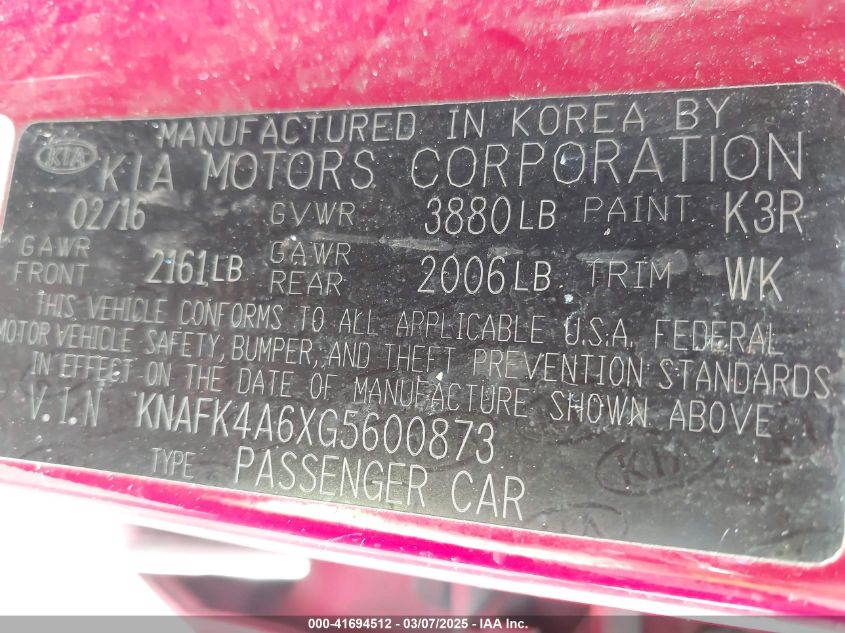 Color RedCylinders 4Drive Front wheel driveVIN KNAFK4A6XG5******State Run & Drive VerifiedDamage Insignificant AutoRIA