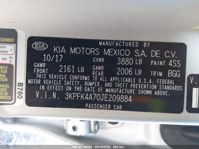 2018 KIA FORTE 2018 Gasoline, 2.0, Front wheel drive, VIN - 3KPFK4A70JE****** from the USA