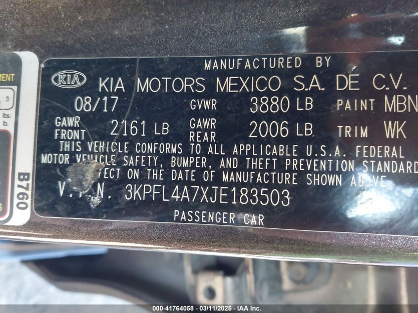 2018 KIA FORTE 2018 Gasoline, 2.0, Front wheel drive, VIN - 3KPFL4A7XJE****** from the USA