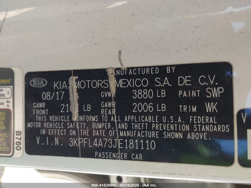 Color WhiteCylinders 4Drive Front wheel driveVIN 3KPFL4A73JE******State Run & Drive VerifiedDamage Front or back AutoRIA