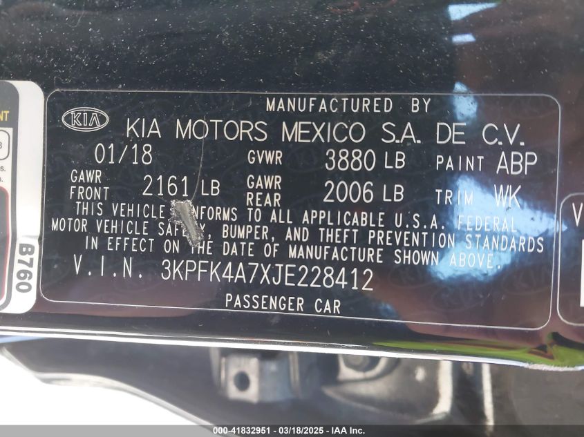 Color BlackCylinders 4Drive Front wheel driveVIN 3KPFK4A7XJE******State Run & Drive VerifiedDamage Left side AutoRIA