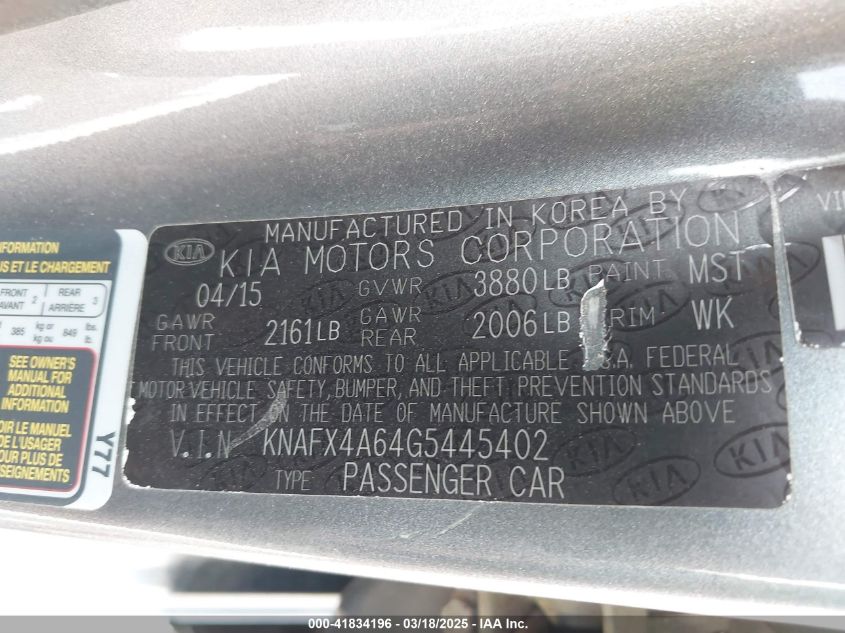 2016 KIA FORTE 2016 Gasoline, 1.8, Front wheel drive, VIN - KNAFX4A64G5****** from the USA