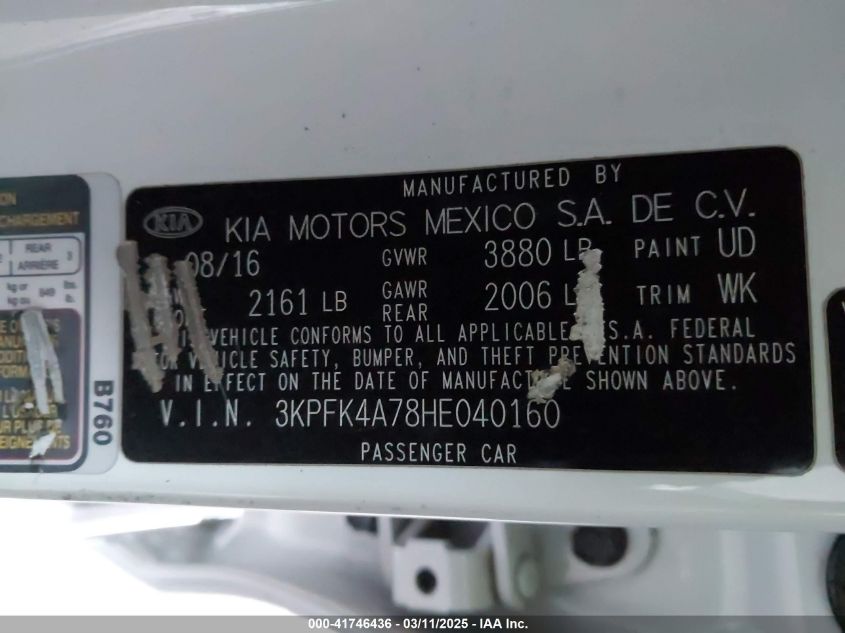 2017 KIA FORTE 2017 Gasoline, 2.0, Front wheel drive, VIN - 3KPFK4A78HE****** from the USA