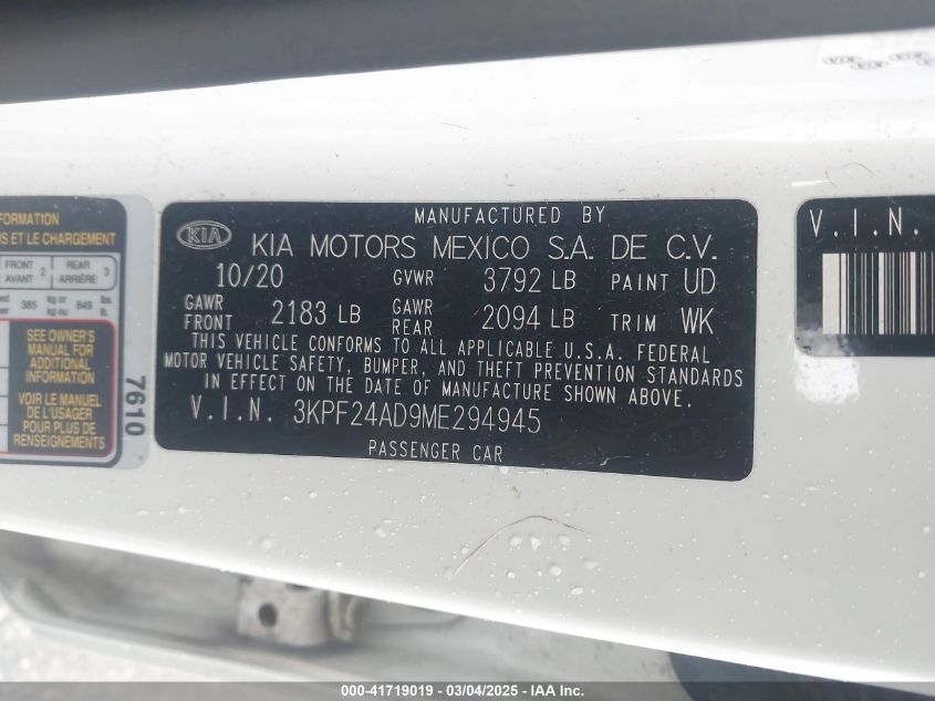 2021 KIA FORTE 2021 Gasoline, 2.0, Front wheel drive, VIN - 3KPF24AD9ME****** from the USA