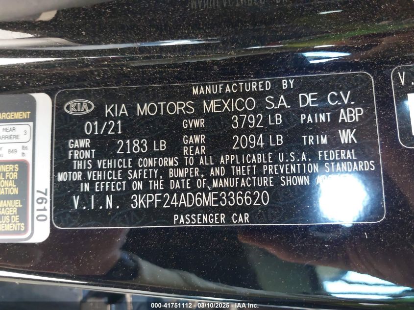 2021 KIA FORTE 2021 Gasoline, 2.0, Front wheel drive, VIN - 3KPF24AD6ME****** from the USA