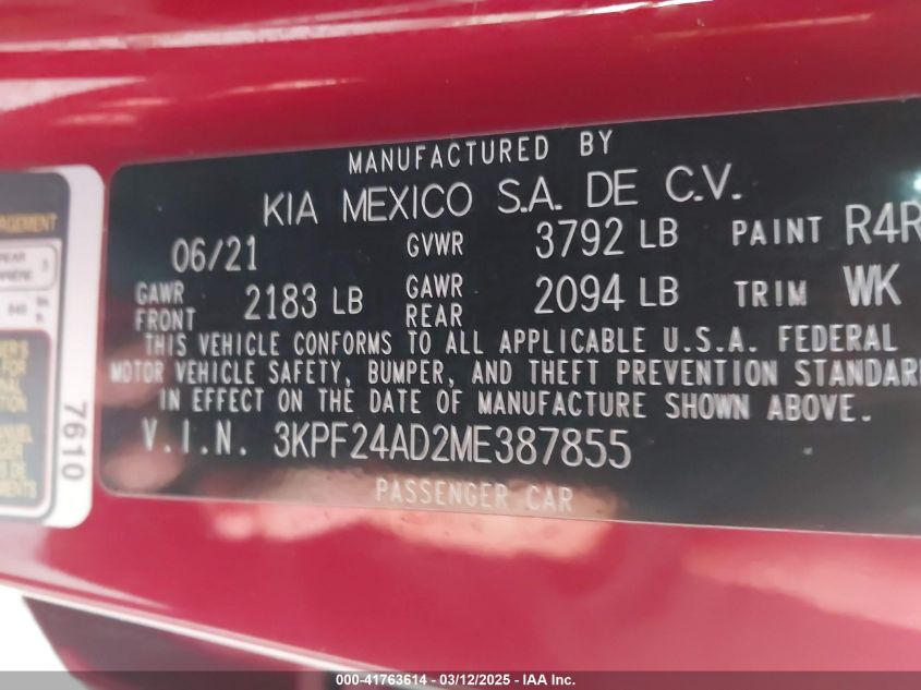 2021 KIA FORTE 2021 Gasoline, 2.0, Front wheel drive, VIN - 3KPF24AD2ME****** from the USA