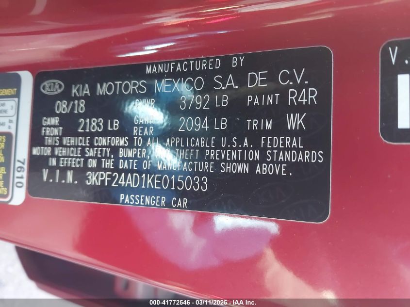 2019 KIA FORTE 2019 Gasoline, 2.0, Front wheel drive, VIN - 3KPF24AD1KE****** from the USA