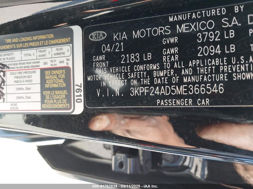 2021 KIA FORTE 2021 Gasoline, 2.0, Front wheel drive, VIN - 3KPF24AD5ME****** from the USA