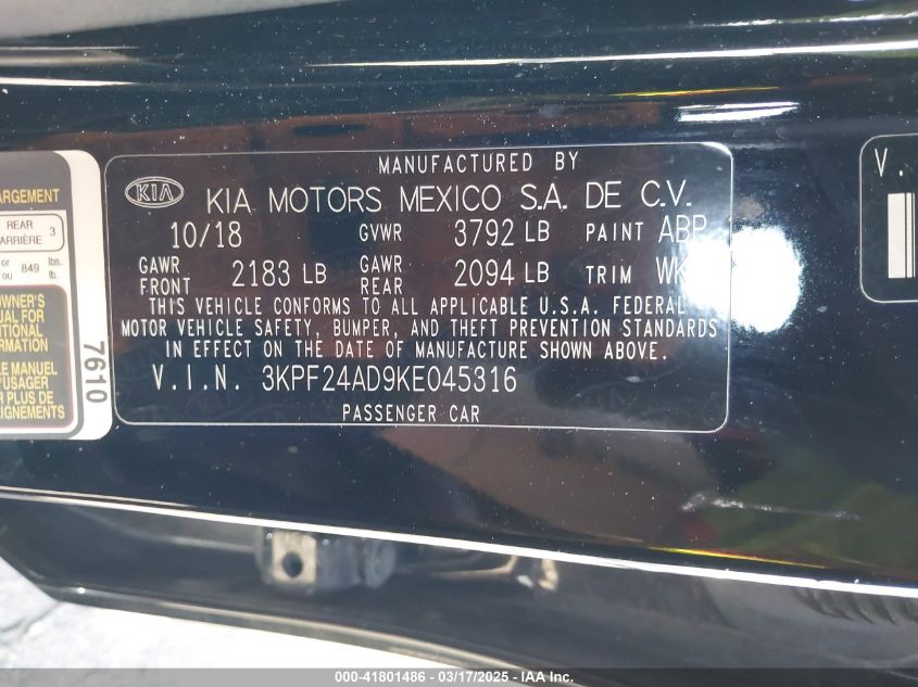 Color BlackCylinders 4Drive Front wheel driveVIN 3KPF24AD9KE******State Run & Drive VerifiedDamage Front or back AutoRIA