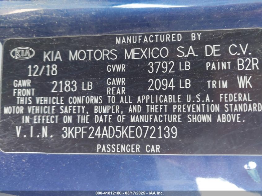 2019 KIA FORTE 2019 Gasoline, 2.0, Front wheel drive, VIN - 3KPF24AD5KE****** from the USA