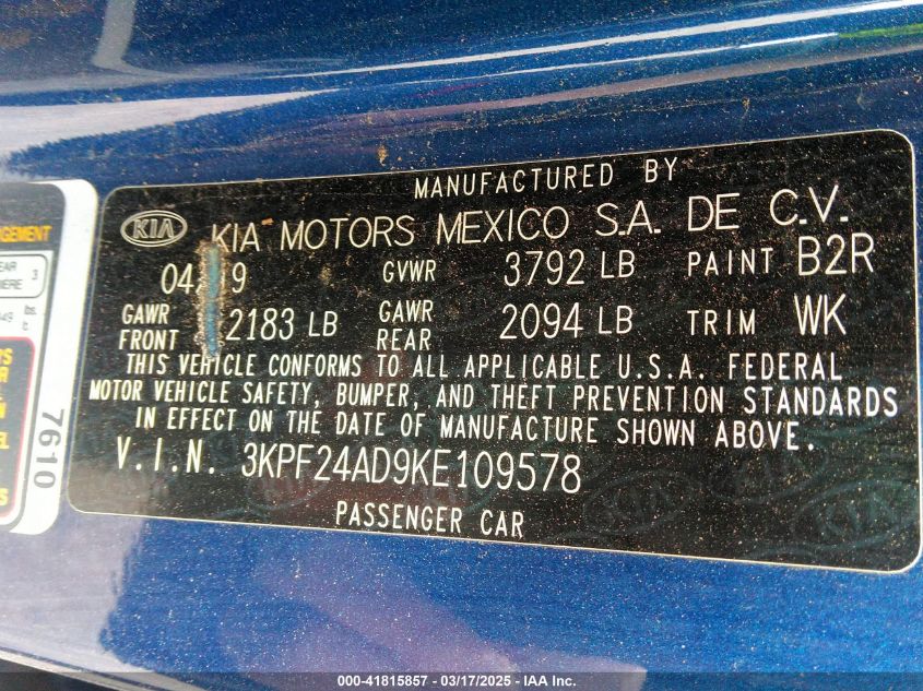 2019 KIA FORTE 2019 Gasoline, 2.0, Front wheel drive, VIN - 3KPF24AD9KE****** from the USA