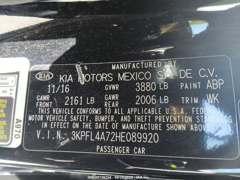 Color BlackCylinders 4Drive Front wheel driveVIN 3KPFL4A72HE******State Run & Drive VerifiedDamage Water AutoRIA