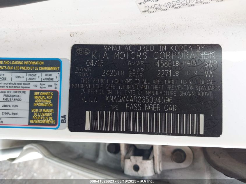 Color WhiteCylinders 4Drive Front wheel driveVIN KNAGM4AD2G5******State Run & Drive VerifiedDamage Left side AutoRIA