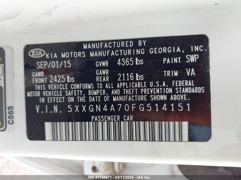 2015 KIA OPTIMA 2015 Gasoline, 2.4, Front wheel drive, VIN - 5XXGN4A70FG****** from the USA