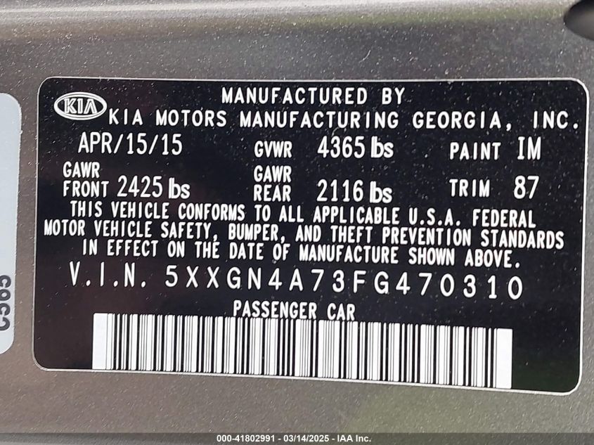 Color GrayCylinders 4Drive Front wheel driveVIN 5XXGN4A73FG******State Run & Drive VerifiedDamage Insignificant AutoRIA