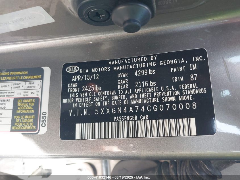 Color GrayCylinders 4Drive Front wheel driveVIN 5XXGN4A74CG******State Run & Drive VerifiedDamage Front or back AutoRIA