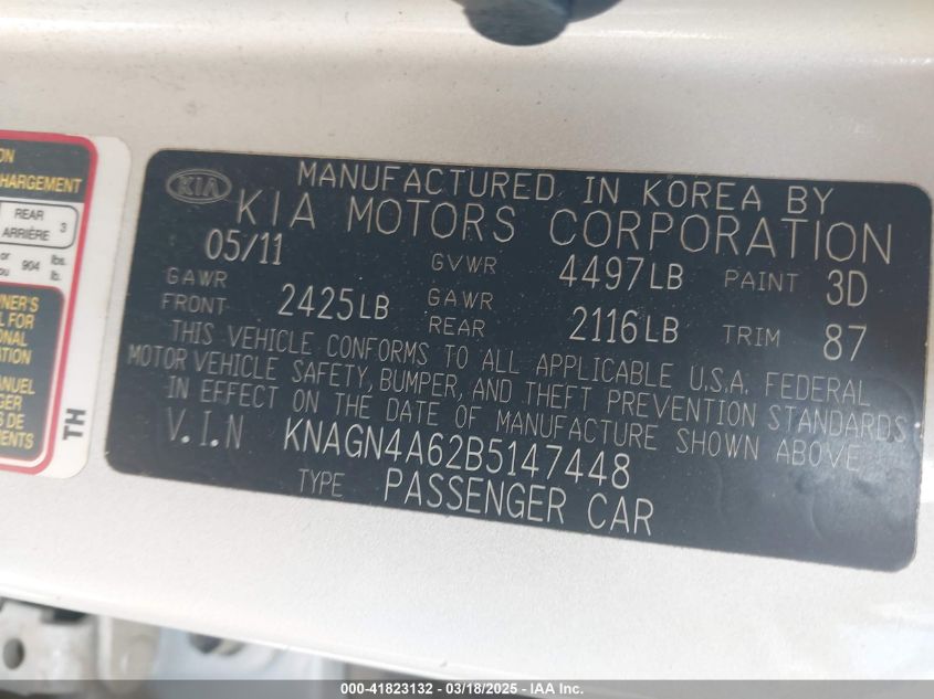 2011 KIA OPTIMA 2011 Gasoline, 2.0, Front wheel drive, VIN - KNAGN4A62B5****** from the USA