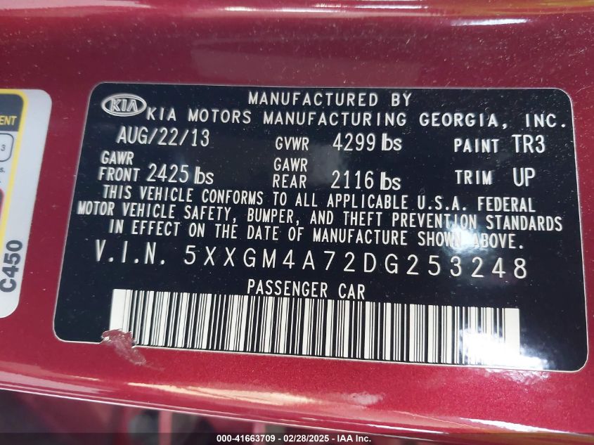 Color BurgundyCylinders 4Drive Front wheel driveVIN 5XXGM4A72DG******State Run & Drive VerifiedDamage Front or back AutoRIA