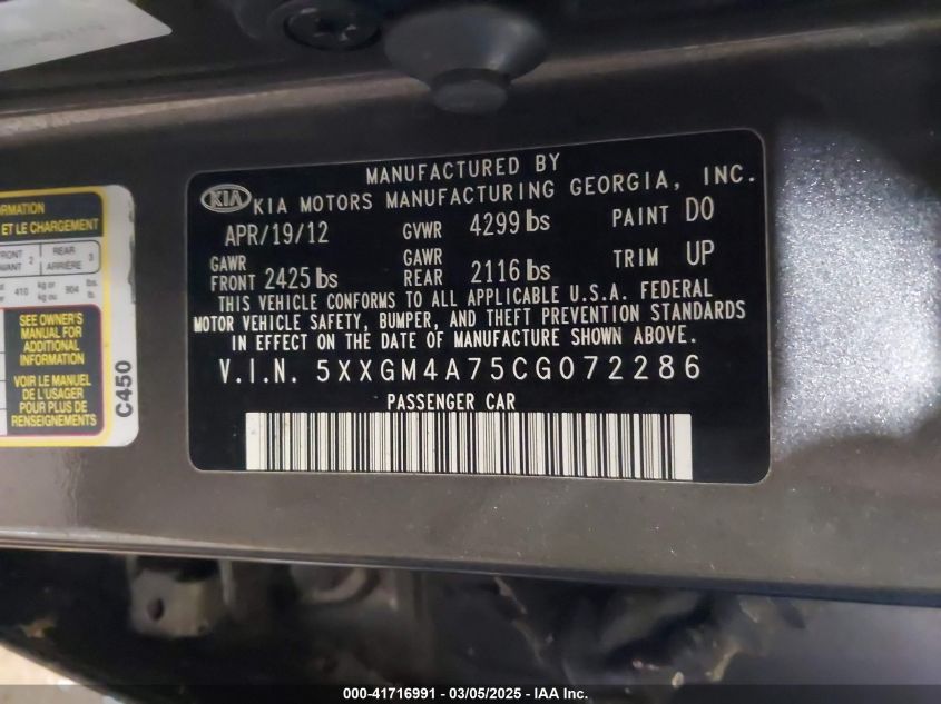 Color GrayCylinders 4Drive Front wheel driveVIN 5XXGM4A75CG******State Run & Drive VerifiedDamage InsignificantAuction date 2025-03-20 AutoRIA