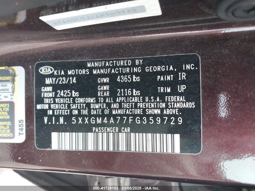 2015 KIA OPTIMA 2015 Gasoline, 2.4, Front wheel drive, VIN - 5XXGM4A77FG****** from the USA
