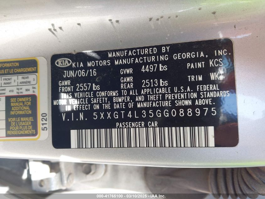 2016 KIA OPTIMA 2016 Gasoline, 2.4, Front wheel drive, VIN - 5XXGT4L35GG****** from the USA
