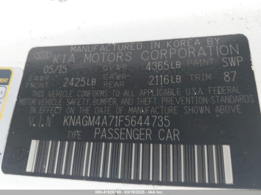 2015 KIA OPTIMA 2015 Gasoline, 2.4, Front wheel drive, VIN - KNAGM4A71F5****** from the USA