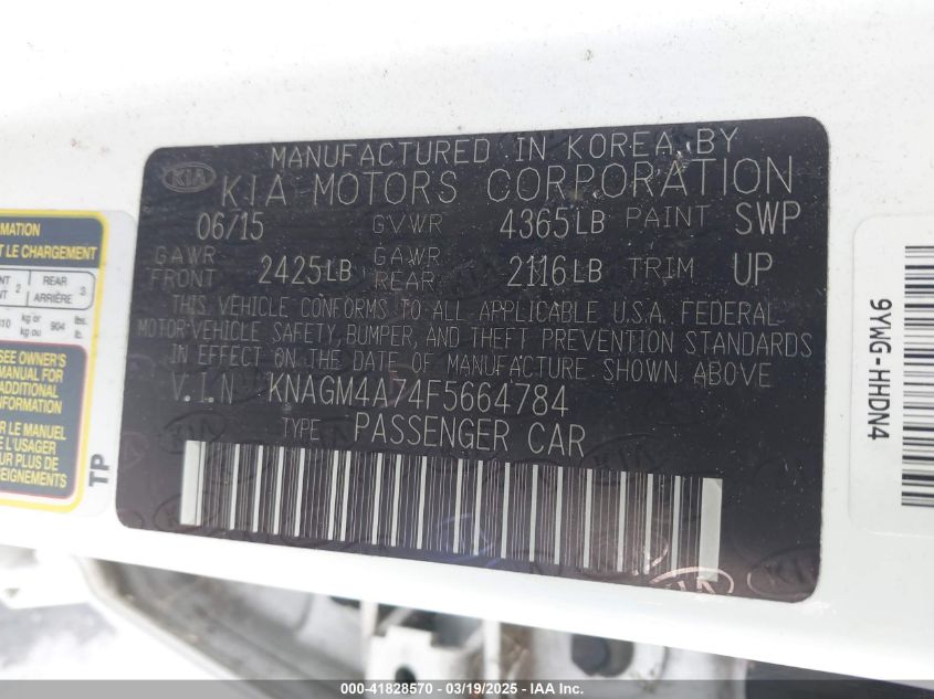 2015 KIA OPTIMA 2015 Gasoline, 2.4, Front wheel drive, VIN - KNAGM4A74F5****** from the USA