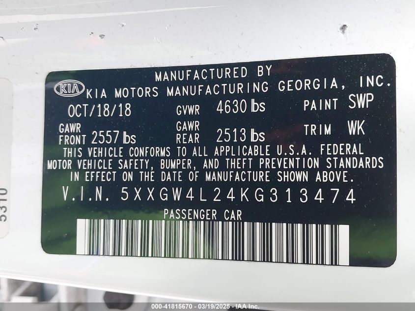 2019 KIA OPTIMA 2019 Gasoline, 2.0, Front wheel drive, VIN - 5XXGW4L24KG****** from the USA