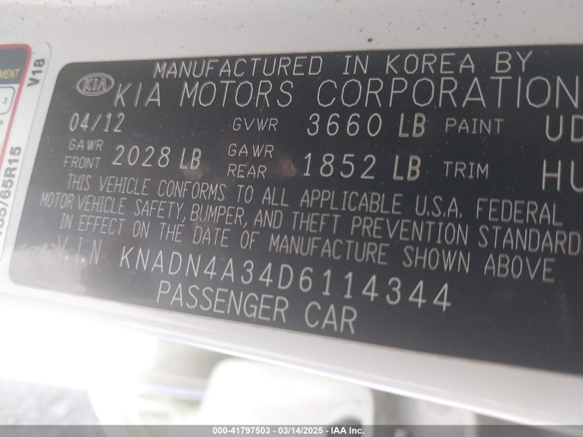 Color WhiteCylinders 4Drive Front wheel driveVIN KNADN4A34D6******State Run & Drive VerifiedDamage Front or back AutoRIA
