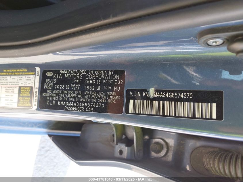 Color BlueCylinders 4Drive Front wheel driveVIN KNADM4A34G6******State Run & Drive VerifiedDamage BackAuction date 2025-03-25 AutoRIA
